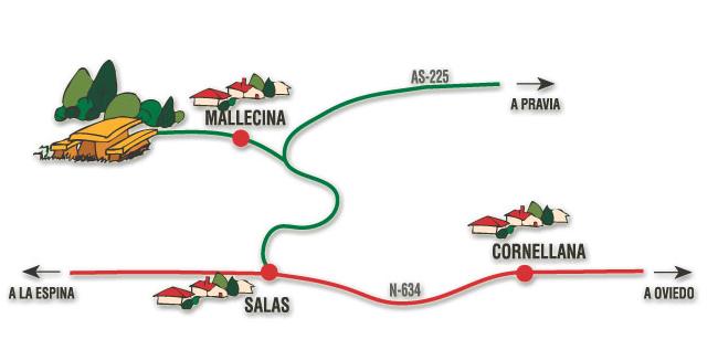 Desde la nacional N-634 que llega a Salas, se coge la AS-225 dirección Pravia, en el km 11 girar a la izquierda hacia Mallecina y a unos 300m está el área recreativa.